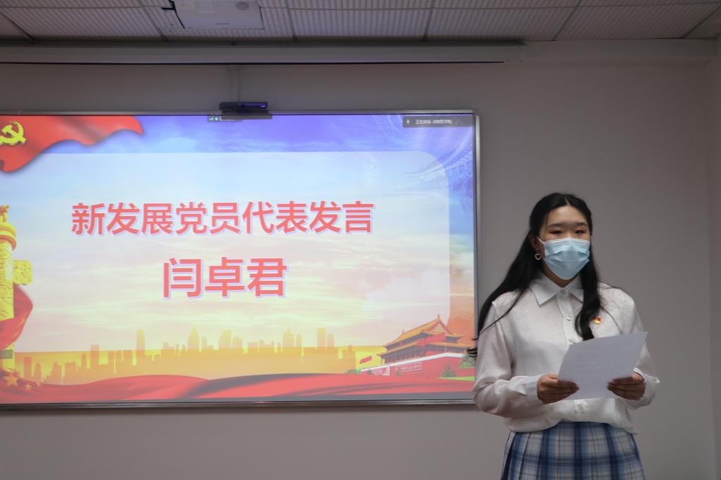随后新发展党员闫卓君作为代表发言,她号召全体新发展党员:要珍惜青春时光,学习专业知识。严格要求自身,思想要求上进。恪守入党誓言,实践中重承诺。